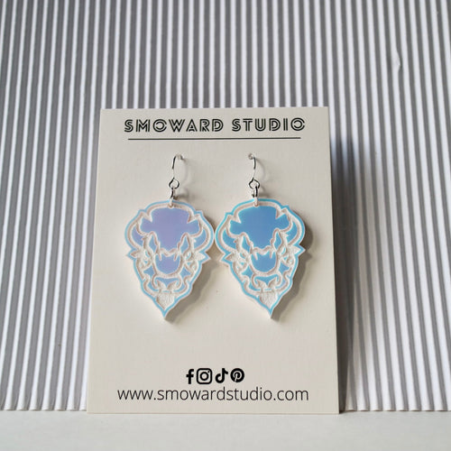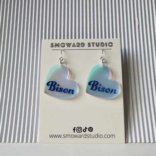 Iridescent heart with blue bison text